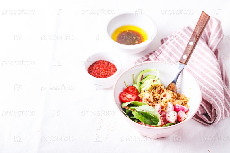 Свежий салат с кускусом, помидорами, огурцом, редисом и мангольдом