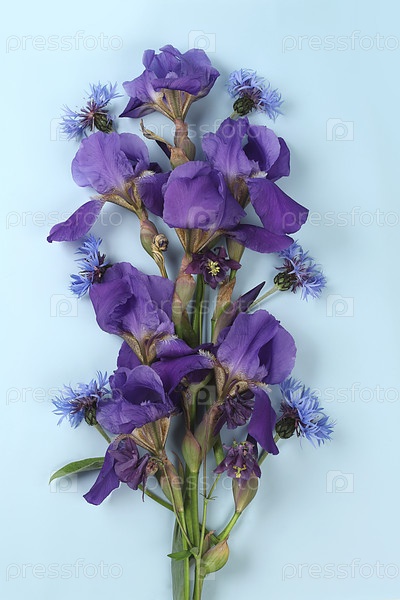 Красивый букет ирисов на светлом фоне, абстрактная цветочная композиция и натюрморт, летний баннер. Креативный современный букет. Открытка на день матери, с днем рождения, свадьба, узор,