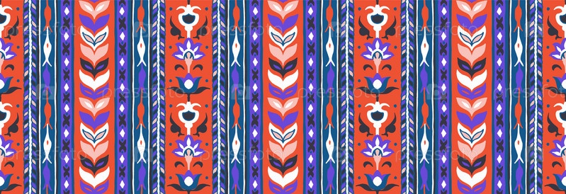 Геометрический дамасский орнамент. Икат границы. Этническая вышивка с листьями и монограммами. Племенная векторная текстура. Бесшовный народный узор в ацтекском стиле. Индийский, скандинавский, цыганский, мексиканский, африканский ковер