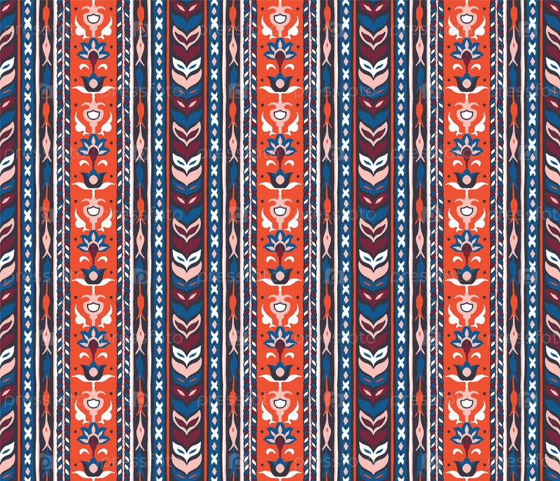 Геометрический дамасский орнамент. Икат границы. Этническая вышивка с листьями и монограммами. Племенная векторная текстура. Бесшовный народный узор в ацтекском стиле. Индийский, скандинавский, цыганский, мексиканский, африканский ковер