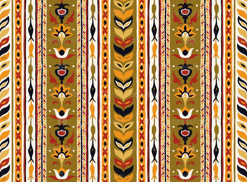 Геометрический дамасский орнамент. Икат границы. Этническая вышивка с листьями и монограммами. Племенная векторная текстура. Бесшовный народный узор в ацтекском стиле. Индийский, скандинавский, цыганский, мексиканский, африканский ковер