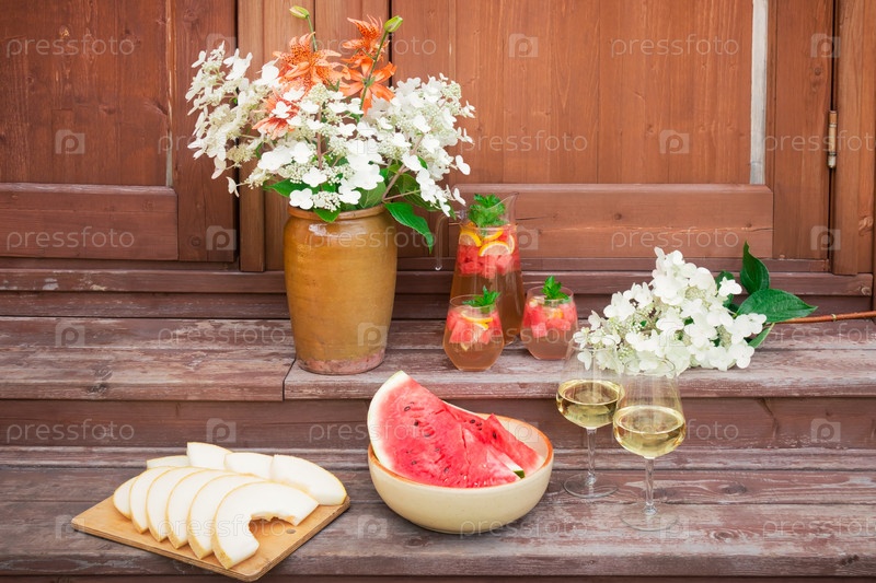 Букет в глиняной вазе, арбуз, арбузный лимонад, белое вино и дыня находятся на ступеньках деревенской деревянной лестницы