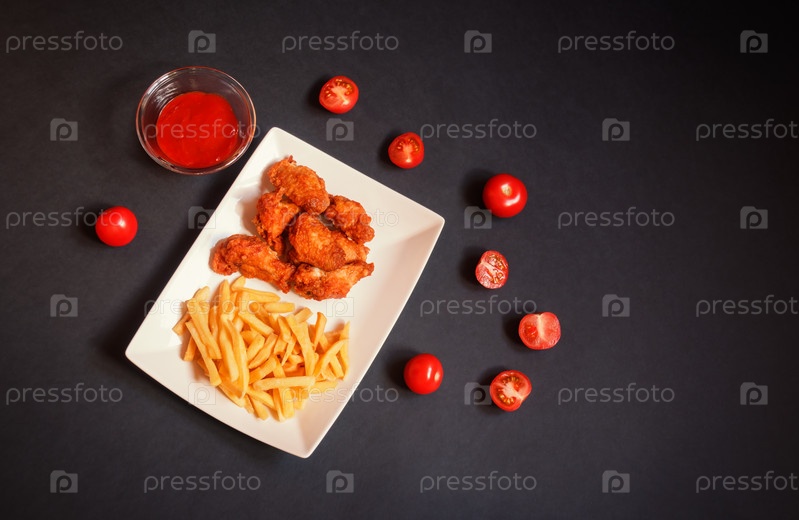 Куриные крылышки с картофелем фри и свежими спелыми помидорами на темном фоне