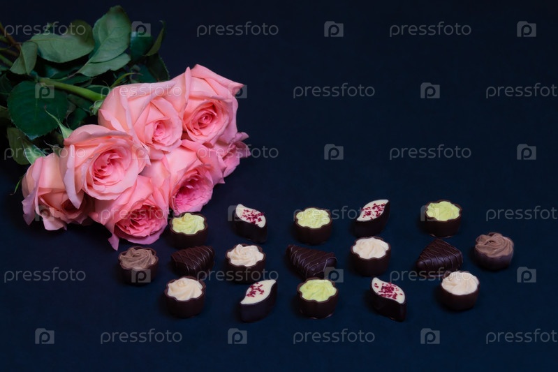 Розовые розы и шоколадные конфеты на темном фоне. Выборочный фокус