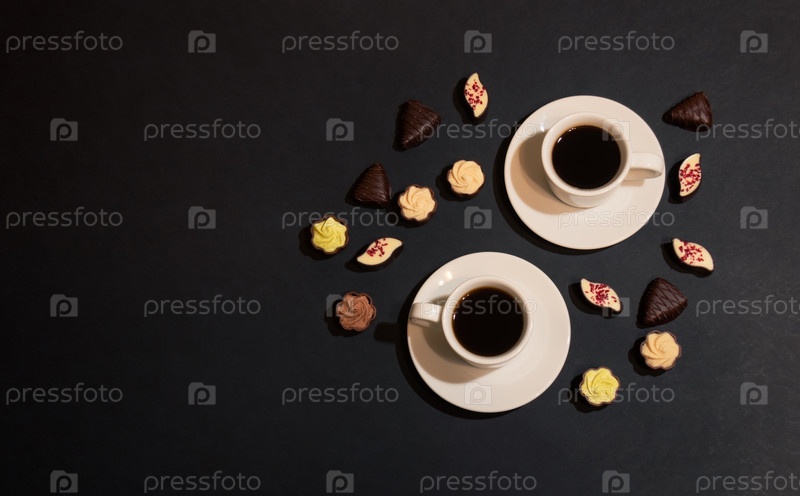 Две чашки кофе и шоколадные конфеты на темном фоне