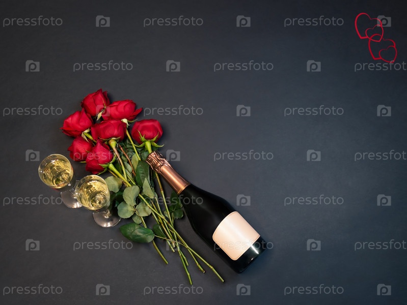 Концепция дня святого Валентина. Бутылка шампанского, бокалы шампанского и красные розы