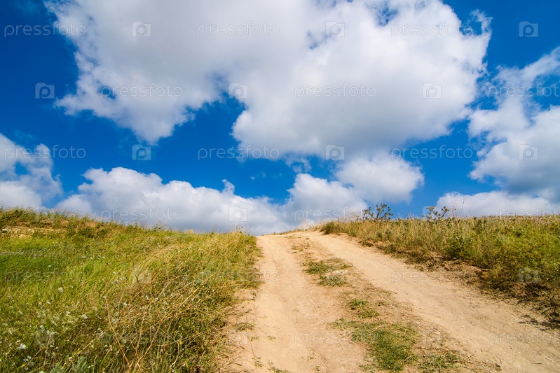 Грунтовая дорога на холме уходит высоко в небо