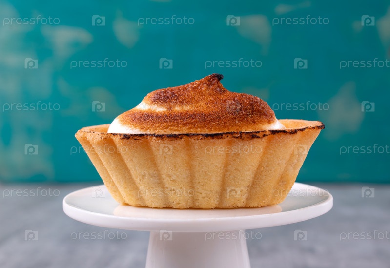 Карамелизированное итальянское безе в песочном тарталетке на бирюзовом фоне. Взбитый десерт. Крупный план
