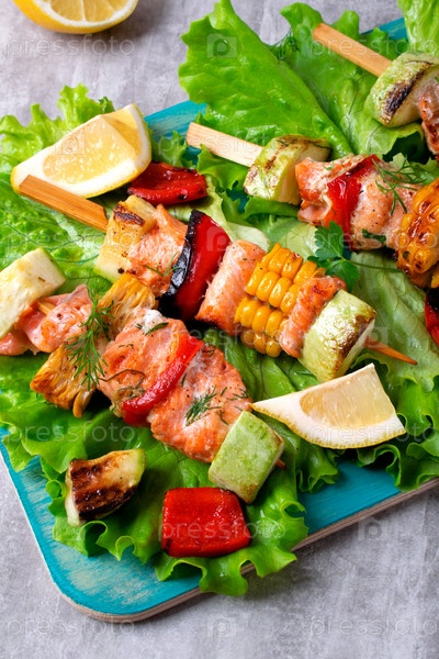 Шашлычки из форели на гриле с кукурузой, цукини и перцем, подаются на листьях салата. Горячее блюдо из красной рыбы