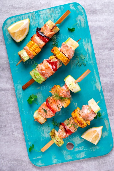 Жареные шашлычки из форели с кукурузой, цукини и перцем подаются на бирюзовой доске. Горячее рыбное блюдо. Вид сверху