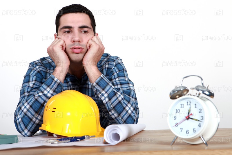 Строительный рабочий с планами и будильником