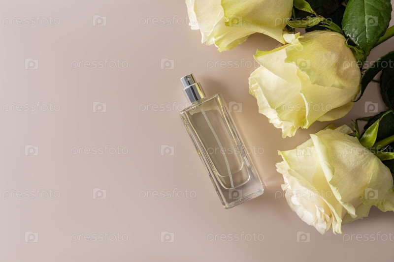 Красивый флакон духов или спрей на пастельном фоне с большими белыми чайными розами. Копия пространства. Макет пустой бутылки