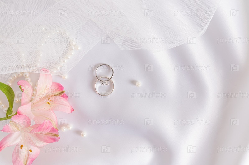 Нежный свадебный фон. Два обручальных кольца из платины с бриллиантами на белой атласной ткани, часть фаты невесты, розовые цветы