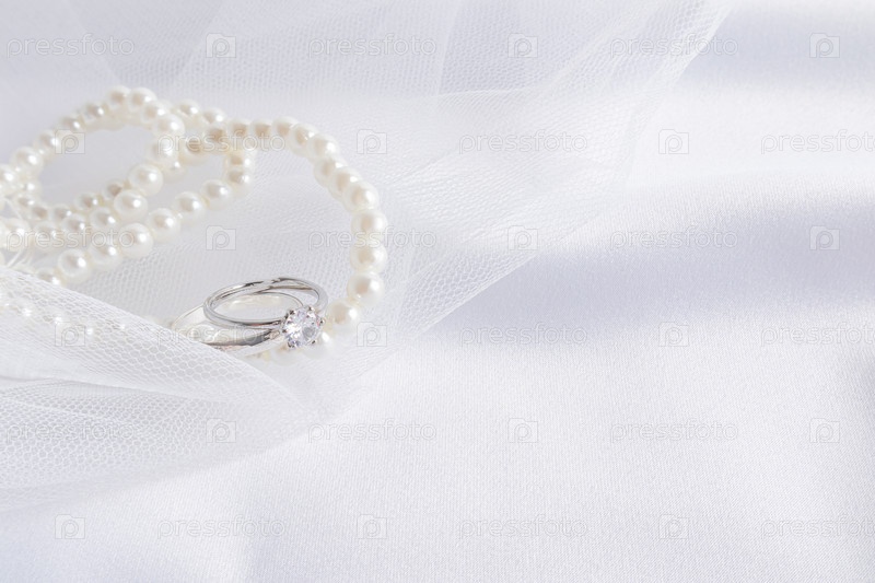 Нежный свадебный фон. Два помолвочных кольца из белого золота с бриллиантом на белой вышитой фате и жемчужное колье. место для текста