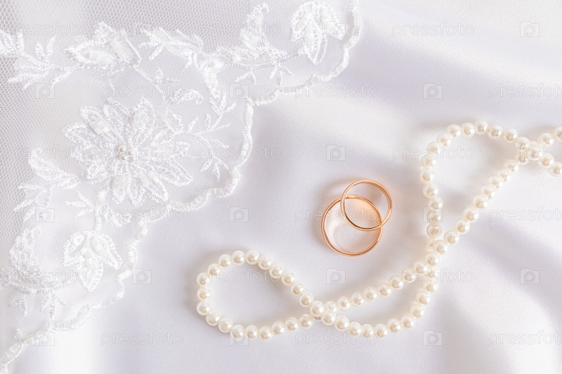 Красивый свадебный фон. Два золотых обручальных кольца на белом атласе с богато расшитой фатой и жемчужными бусинами. открытка, обложка