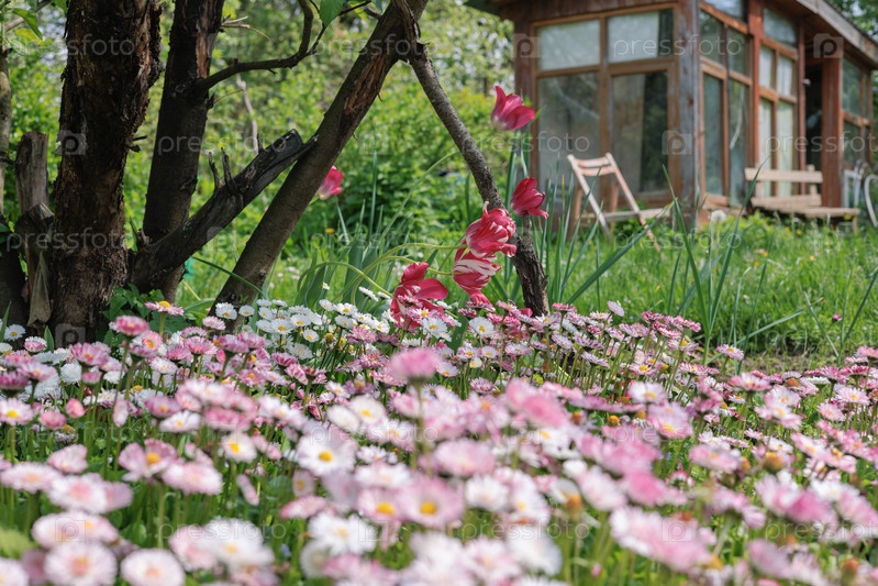 Красные тюльпаны и розовые ромашки в саду с деревянным домом