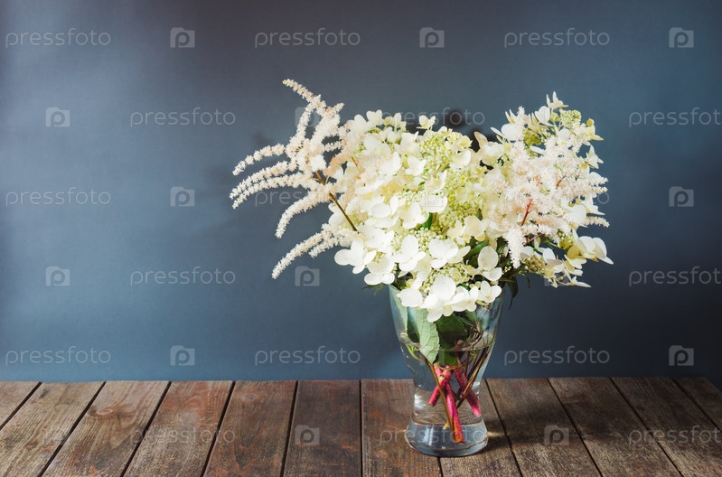 Белые красивые цветы астильбы и гортензии в стеклянной вазе на деревянном столе. Выборочный фокус