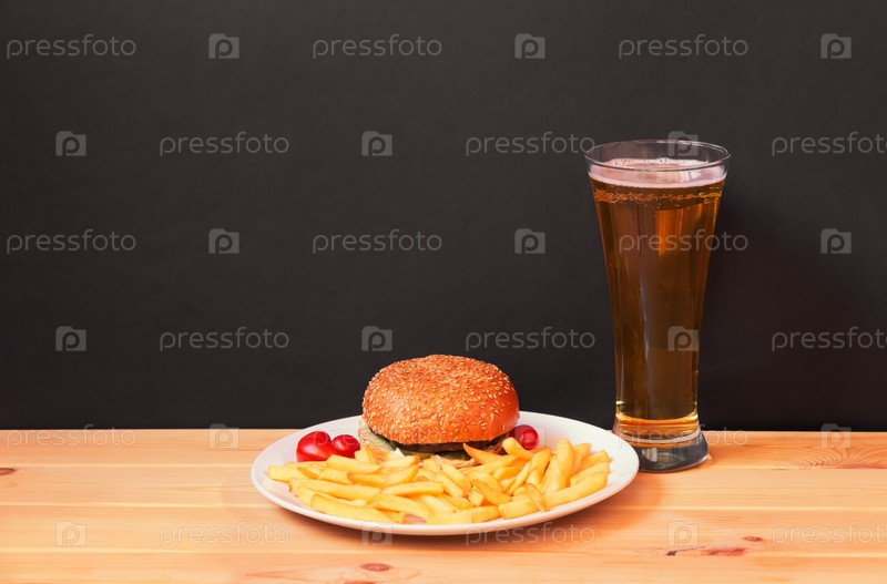 Стакан пива, гамбургер и жареный картофель на деревянном столе на темном фоне