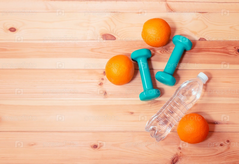 Две зеленые гантели, бутылка воды и апельсины на деревянном фоне. Концепция фитнеса и здорового питания