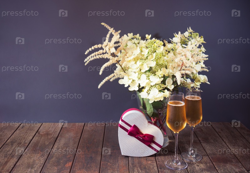 Белые красивые цветы астильбы и гортензии, бокалы шампанского и подарочная коробка в форме сердца на деревянном столе. Выборочный фокус