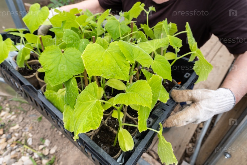 Садовник держит коробку с рассадой зеленых огурцов, выращивает огурцы в теплице