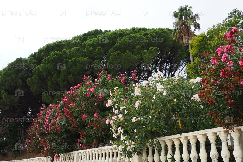Олеандр, Nerium oleander Apocynaceae, представляет собой ядовитый кустарник. Его используют в садах из-за его розовых цветов. Побережье Герцег-Нови, Черногория. Адриатическое море Средиземное море. Красивая белая балюстрада