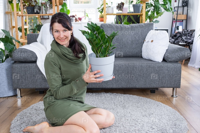 Неприхотливый и популярный замиокулькас в руках женщины в интерьере оранжереи со стеллажами из коллекций домашних растений. Домашнее растениеводство