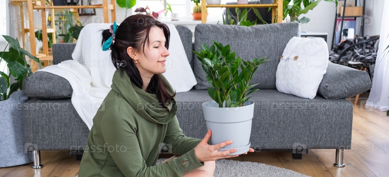 Неприхотливый и популярный замиокулькас в руках женщины в интерьере оранжереи со стеллажами из коллекций домашних растений. Домашнее растениеводство