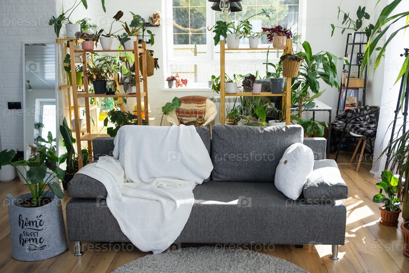 Стеллаж с группой комнатных растений в интерьере комнаты белый лофт, серый диван, уютный плед, ковер. Комнатное растение Выращивание и уход за комнатным растением, зеленый дом