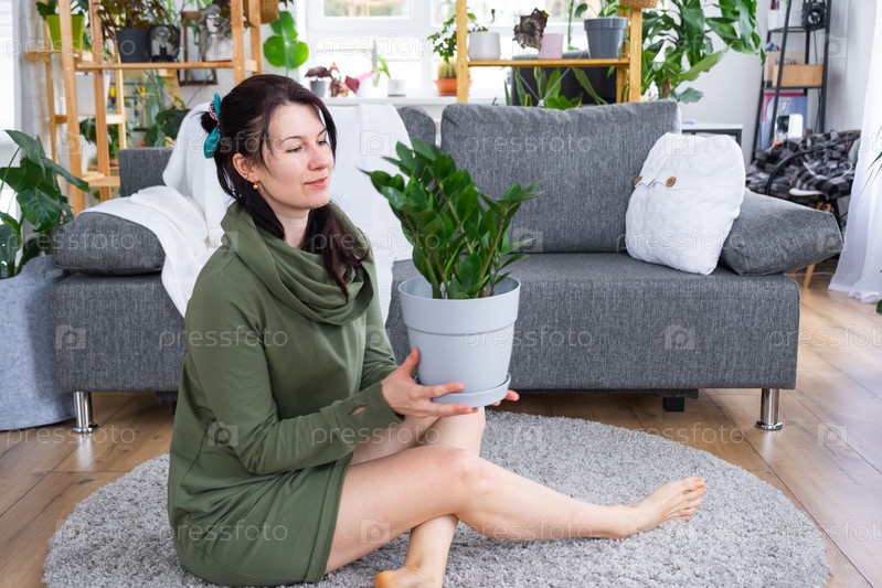 Неприхотливый и популярный замиокулькас в руках женщины в интерьере оранжереи со стеллажами из коллекций домашних растений. Домашнее растениеводство