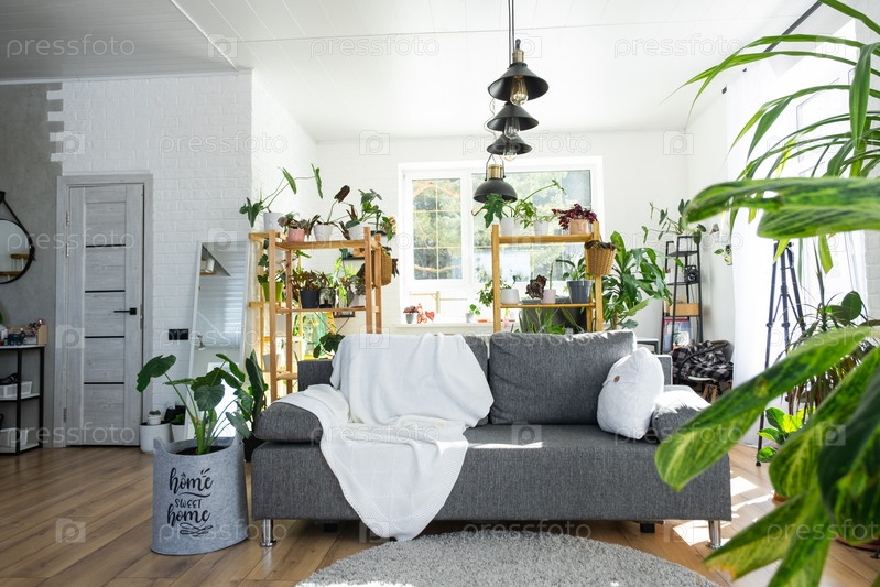 Стеллаж с группой комнатных растений в интерьере комнаты белый лофт, серый диван, уютный плед, ковер. Комнатное растение Выращивание и уход за комнатным растением, зеленый дом