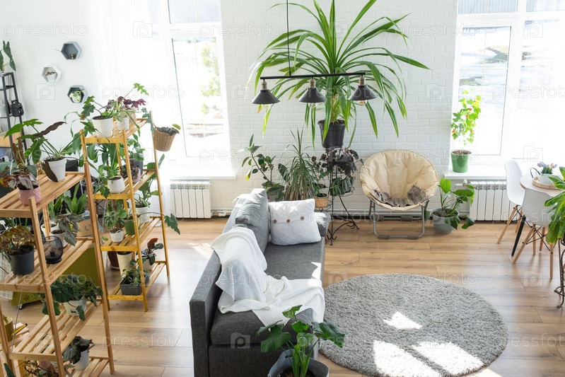 Стеллаж с группой комнатных растений в интерьере комнаты белый лофт, серый диван, уютный плед, ковер. Комнатное растение Выращивание и уход за комнатным растением, зеленый дом