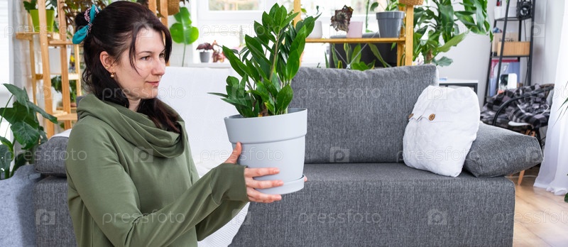 Неприхотливый и популярный замиокулькас в руках женщины в интерьере оранжереи со стеллажами из коллекций домашних растений. Домашнее растениеводство