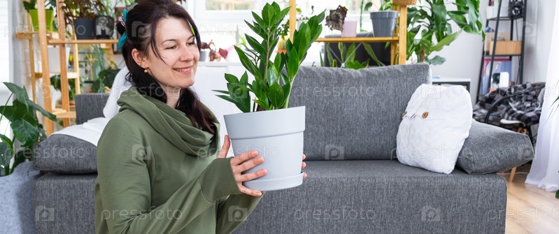 Неприхотливый и популярный замиокулькас в руках женщины в интерьере оранжереи со стеллажами из коллекций домашних растений. Домашнее растениеводство
