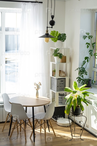Интерьер дома с большими окнами и домашними растениями, круглый стол, стулья, белый лофт. Комнатное растение уход за комнатным растением, зеленый дом