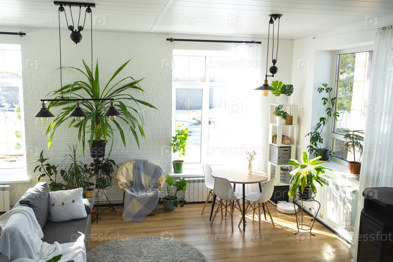 Стеллаж с группой комнатных растений в интерьере комнаты белый лофт, серый диван, уютный плед, ковер. Комнатное растение Выращивание и уход за комнатным растением, зеленый дом