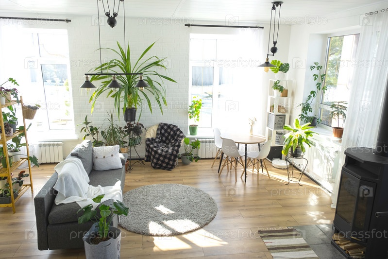 Стеллаж с группой комнатных растений в интерьере комнаты белый лофт, серый диван, уютный плед, ковер. Комнатное растение Выращивание и уход за комнатным растением, зеленый дом
