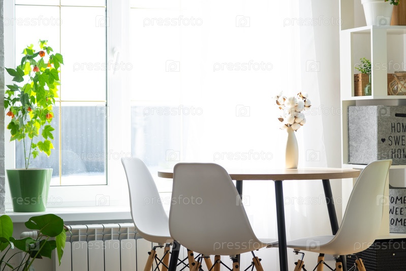 Интерьер дома с большими окнами и домашними растениями, круглый стол, стулья, белый лофт. Комнатное растение уход за комнатным растением, зеленый дом
