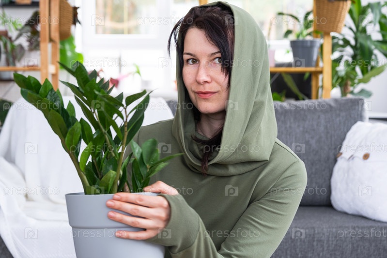 Неприхотливый и популярный замиокулькас в руках женщины в интерьере оранжереи со стеллажами из коллекций домашних растений. Домашнее растениеводство