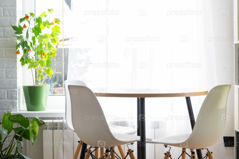 Интерьер дома с большими окнами и домашними растениями, круглый стол, стулья, белый лофт. минимализм, белая занавеска
