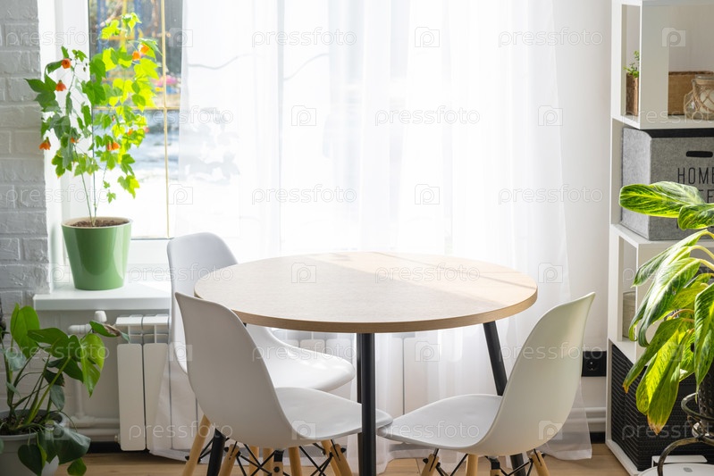 Интерьер дома с большими окнами и домашними растениями, круглый стол, стулья, белый лофт. минимализм, белая занавеска