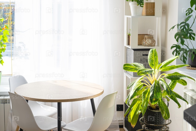 Интерьер дома с большими окнами и домашними растениями, круглый стол, стулья, белый лофт. Комнатное растение уход за комнатным растением, зеленый дом