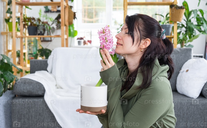 Весенний цветочный гиацинт расцвел дома в горшке в руках женщины в интерьере оранжереи со стеллажами из коллекций домашних растений. Домашнее растениеводство