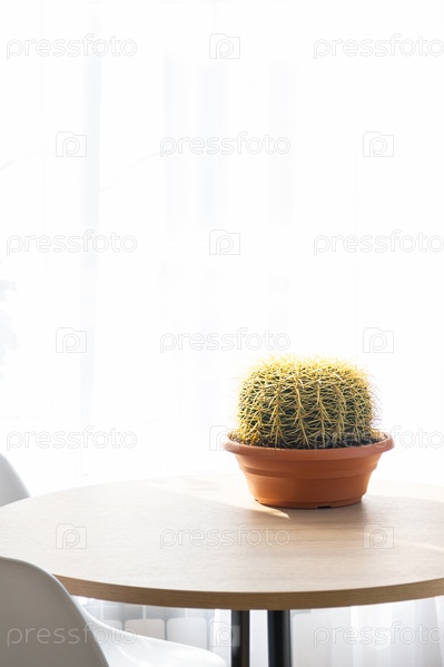 Большой эхинокактус Грузони в интерьере крупным планом на белом фоне. Домашнее растениеводство