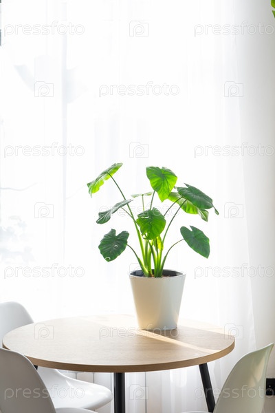 Алоказия макроризы крупным планом в интерьере на столе в кашпо на белом фоне окна с занавеской. Комнатное растение Выращивание и уход за комнатным растением, зеленый дом. Минимализм