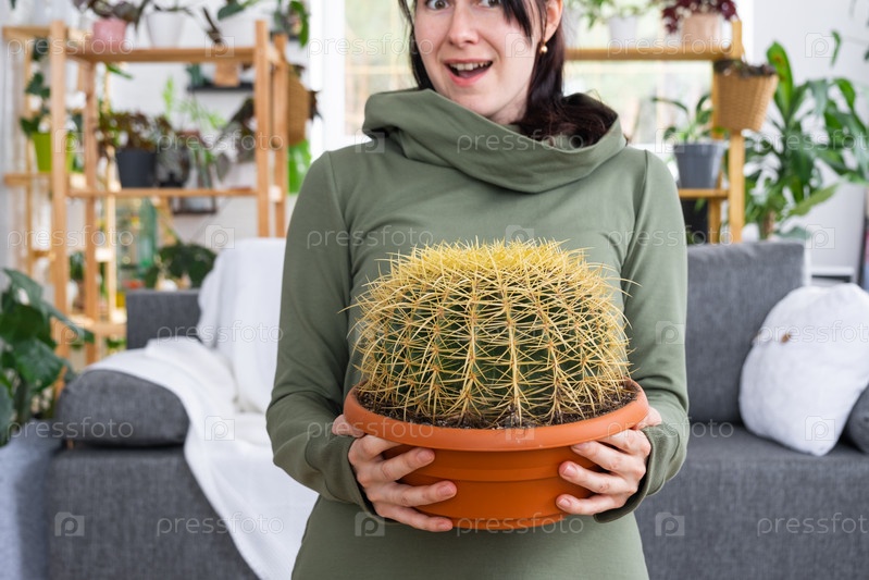 Большой эхинокактус Грузони в руках удивленной и смешной женщины в интерьере зеленого дома с полками из домашних растений. Домашнее растениеводство, любование кактусом в горшке