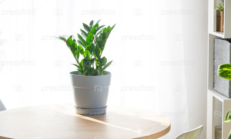 Крупный план замиокулькаса в интерьере на столе в кашпо на белом фоне окна с занавеской. Комнатное растение Выращивание и уход за комнатным растением, зеленый дом. Минимализм
