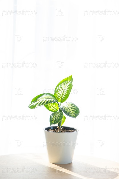 Крупный план Dieffenbachia Tropic Snow в интерьере на круглом столе в горшке на белом фоне окна с занавеской. комнатное растение Выращивание и уход за комнатным растением, зеленый дом. минимализм