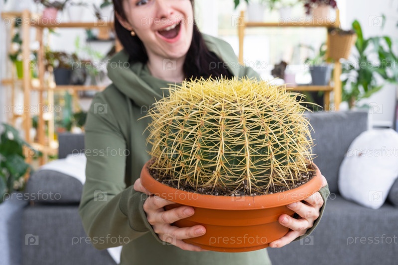 Большой эхинокактус Грузони в руках удивленной и смешной женщины в интерьере зеленого дома с полками из домашних растений. Домашнее растениеводство, любование кактусом в горшке