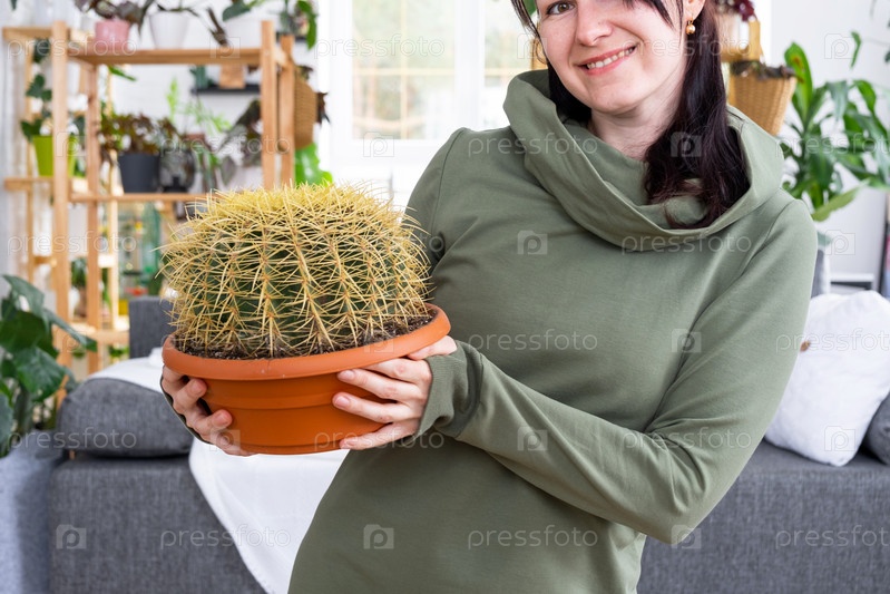 Большой эхинокактус Грузони в руках женщины в интерьере оранжереи со стеллажными коллекциями домашних растений. Домашнее растениеводство, селекционер любуется кактусом в горшке